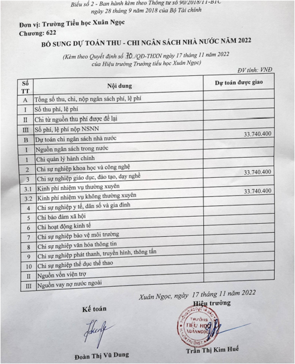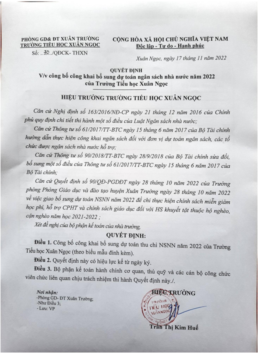 Công khai bổ sung dự toán Ngân sách nhà nước năm 2022 để chi thực hiện chính sách hỗ trợ chi phí học tập và chính sách GD đối với học sinh khuyết tật thuộc hộ nghèo, cận nghèo năm học 2021-2022 của trường Tiểu học Xuân Ngọc.